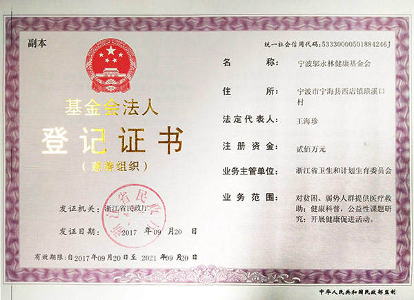 寧波鄔永林健康基金會(huì),成立于2010年10月,是在浙江省民政廳注冊(cè)、由浙江省衛(wèi)生健康委主管的非公募基金會(huì)?;饡?huì)的原始基金數(shù)額為人民幣貳佰萬(wàn)元,來(lái)源于雙林股份有限公司。《慈善法》頒布后,本基金會(huì)被認(rèn)定為慈善組織。